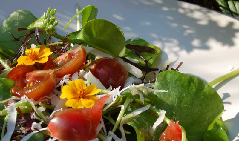 Posteleinsalat mit Rotem Senf und Orangentagetesblüten