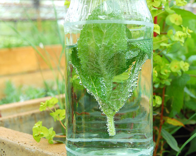 Eher durch Zufall bin ich auf ein köstliches und einfaches Rezept für leckere Kräuterlimo gekommen. Man nehme eine Flasche Mineralwasser und trinke einen großen Schluck ab. Dann ein Zweig Apfelminze in die Flasche stecken, schließen und etwa 20 Minuten stehen lassen. Die Minze aromatisiert das Wasser auf natürliche Weise.