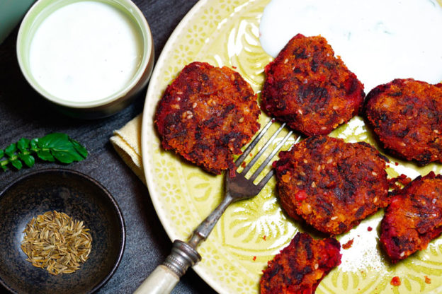 Rote Bete-Linsen-Bratlinge mit Barbarakresse-Dipp