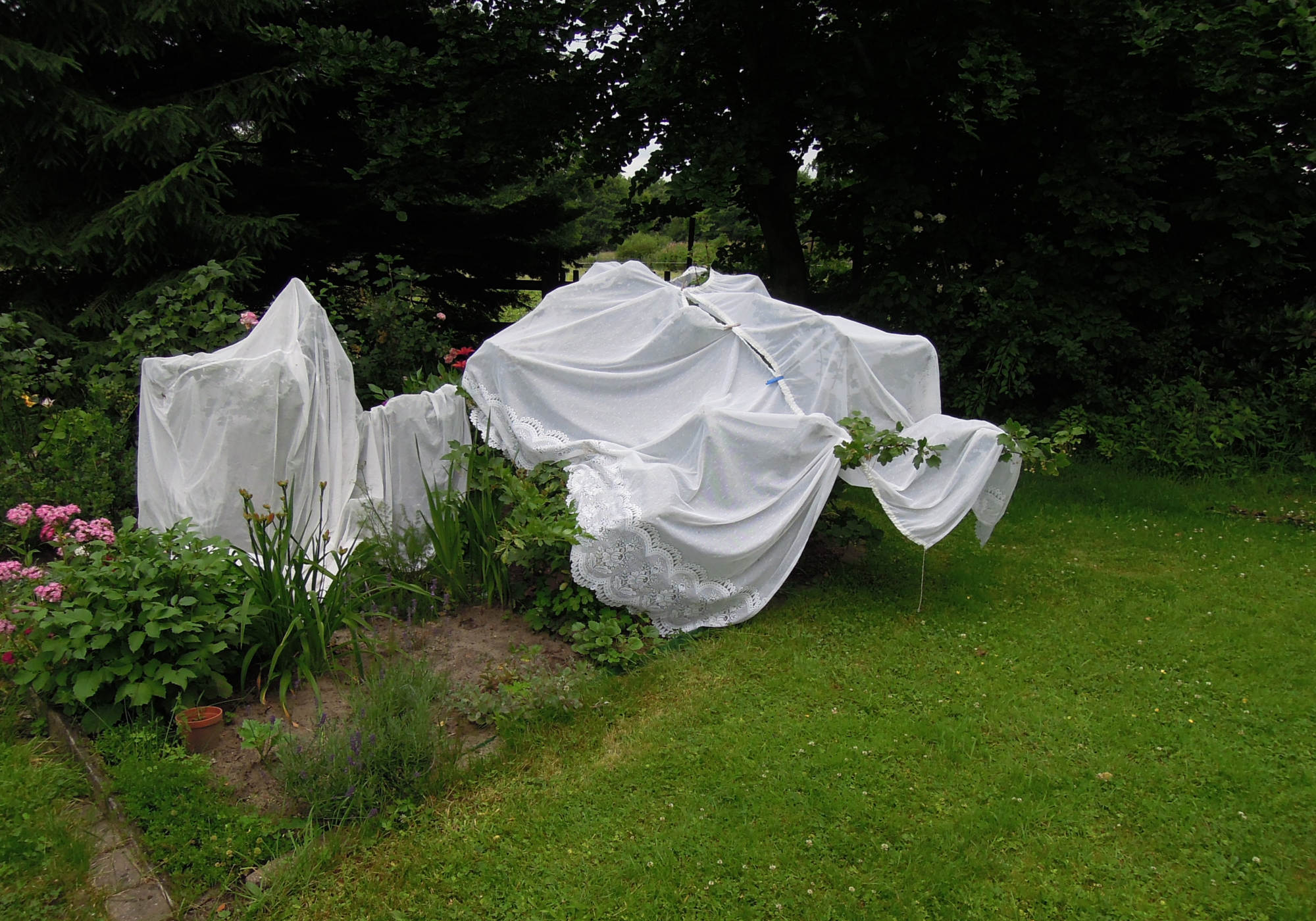 Andere Leute waren schneller und auch kreativ in der Auswahl der Mittel. So findet Omas gute Gardine ( nach’m Krieg vom Munde abgespart) -man beachte die Spitze am Saum- im Garten eines Freundes eine ganz neue Verwendung. Mit Wäscheklammern fest getüddelt hat das gute Stück hier durchaus seine Berechtigung. Fällt auch irgendwie unter Gartenkunst-oder?