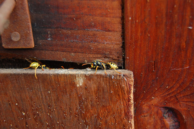 In unserer Gärtnerei steht ein alter Holzspind, in dem wir Dünger und Gelbtafeln aufbewaren. Diesen Ort haben sich etwa 50 Wespen als Überwinterungsplatz ausgewählt.